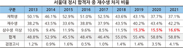 2021학년도 서울대 정시 합격자 중 재학생 비율도 역대 최저인 것으로 나타났다. 재학생 비율은 37.1%로 2017년 52.5%를 기록한 이후 4년 연속 감소하고 있다.