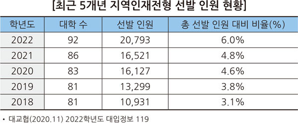 지역인재전형은 ‘지방대학 및 지역균형인재 육성에 관한 법률(지방대학육성법)’에 따라 지난 2014년부터 신설된 전형으로, 수도권 외 지역우수인재의 지역이탈 현상을 방지하기 위해 도입됐다. 지방거점국립대를 중심으로 각 지역 학생들을 일정 비율 이상 선발하도록 권고하고 있는데, 해를 거듭할수록 선발 비율이 증가하고 있다.