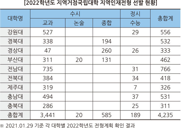강원대 등 지역거점국립대에서는 2022학년도 입시에서 지역인재전형을 통해 수시와 정시 선발인원을 모두 합쳐 4235명을 뽑는다.
