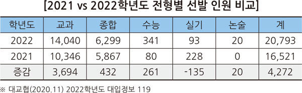 특히 2022학년도에는 학생부교과와 학생부종합, 대학수학능력시험 순으로 선발인원이 증가했는데, 학생부종합전형의 선발인원이 전년대비 5.2% 감소했으나, 그만큼 학생부교과전형 선발인원이 증가했다.