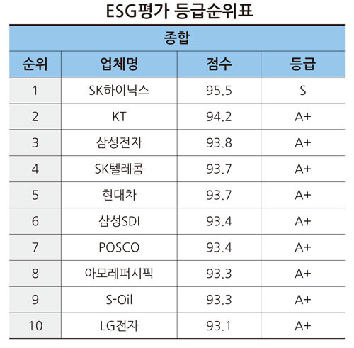 이에 따르면, 국내 시총 50대 기업을 대상으로 ESG 평가지수를 적용한 결과(만점 120점) SK하이닉스가 평점 95.5(E : 95.3점, S : 96.8점, G : 94.6점)로 1위를 기록했다.