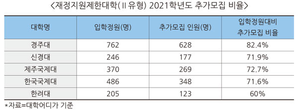 재정지원제한Ⅱ유형 대학별 추가 모집인원은 경주대 628명과 신경대 177명, 제주국제대 269명, 한국국제대 348명, 한려대 123명 등이다.