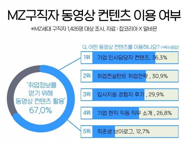 조사 결과 MZ세대 구직자 67%는 유튜브 등 동영상 콘텐츠를 이용해 취업 정보를 얻고 있었다.