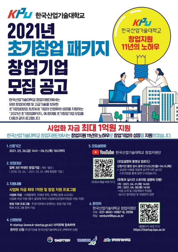 [대학저널 임지연 기자] 한국산업기술대학교(총장 박건수, 이하 산기대) 창업지원단은 유망한 창업아이템 혹은 고급기술을 보유하고 있는 초기창업 기업을 발굴하고 지원하기 위해 오는 4월 15일까지 ‘2021년 초기창업패키지 창업기업’을 모집한다.