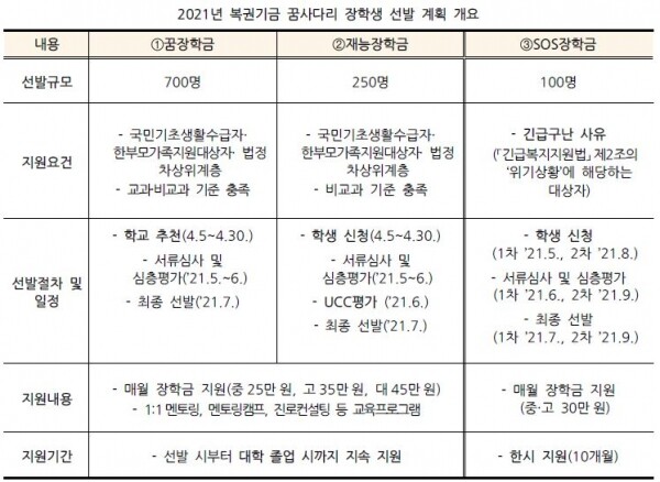 꿈장학금은 학교에서 추천한 저소득층 학생, 재능장학금은 특화된 재능을 보유한 학생, SOS장학금은 질병·재난·재해·가정폭력 등으로 학업중단 위기에 놓인 학생을 지원 대상으로 한다.