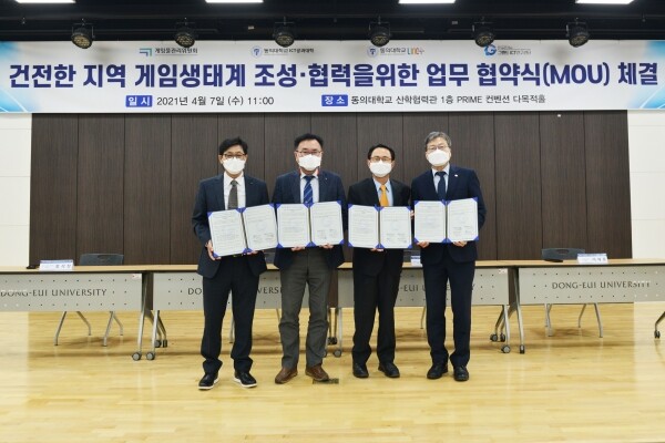 [대학저널 오혜민 기자] 동의대학교(총장 한수환) ICT공과대학(학장 김치용)과 LINC+사업단(단장 이임건), 인공지능그랜드ICT연구센터(센터장 정석찬)는 7일 동의대 산학협력관 1층 프라임 컨벤션 다목적홀에서 게임물관리위원회(위원장 이재홍)와 건전한 지역 게임생태계 조성과 협력을 위한 업무협약을 체결했다.