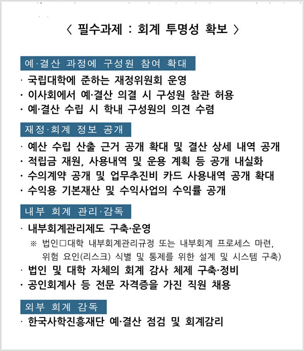 시안에 따르면 사학혁신 지원사업에 지원하려는 학교법인은 회계 투명성 확보 과제를 필수적으로 추진해야 한다.
