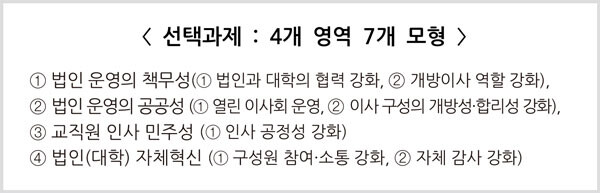 필수 과제 외에도 ▲법인 운영의 책무성 ▲법인 운영의 공공성 ▲교직원 인사의 민주성 ▲자체혁신 등 선택과제 4개 영역 7개 영역도 2개 이상을 선택, 추진해야 한다.