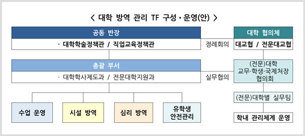 또한 대학 방역 관리 전담팀(TF)도 구성해 21일부터 6월 30일까지 운영한다. 교육부 대학학술정책관과 직업교육정책관을 공동 반장으로 대학 방역관리체계를 구성해 대학 방역점검과 현장 의견수렴에 나선다. TF에는 한국대학교육협의회와 한국전문대학교육협의회 등 대학 협의체와 (전문)대학 교무·학생·국제처장협의회, 대학별 실무팀 등이 참여한다.