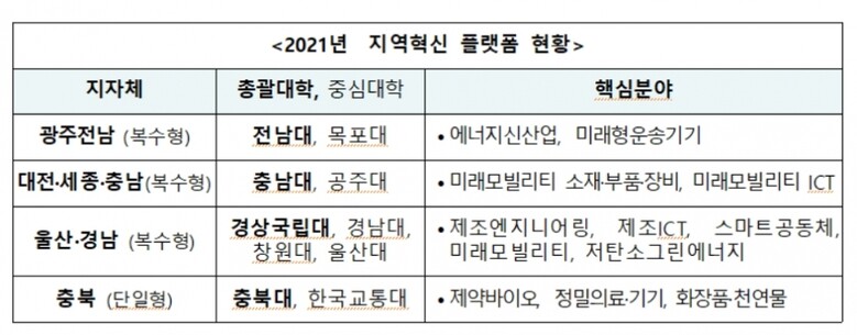 [대학저널 이승환 기자] 대전·세종·충남 플랫폼이 ‘2021년 지자체-대학 협력기반 지역혁신 사업’에 신규 선정됐다. 2020년부터 단일형 사업을 수행해 온 경남 플랫폼은 울산과 연합해 복수형 울산·경남 플랫폼으로 전환한다.
