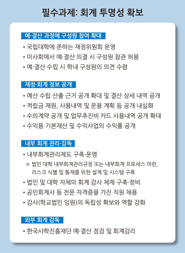 특히 예시과제에는 재정위원회 운영과 이사회 참관, 적립금 공개 강화, 회계 전문인력 채용, 내부 회계감사 체제 구축 등 국립대나 공공기관에서 이미 실시하는 과제를 다수 포함해 사학의 공공성을 공공기관 수준으로 견인한다는 방침이다.