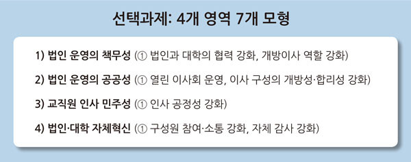 아울러 필수 과제 외에도 ▲법인 운영의 책무성 ▲법인 운영의 공공성 ▲교직원 인사의 민주성 ▲자체혁신 등 4개 분야와 관련해 교육부가 제시한 7개 모형 중 2개 이상을 선택해 추진해야 한다.