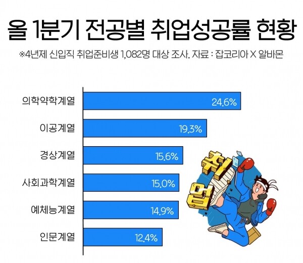 [대학저널 황혜원 기자] 올 1분기 채용시장에서 최종 합격통보를 받은 신입 구직자는 16.9%에 불과한 것으로 나타났다. 의·약학계열 전공자의 합격률은 24.6%로 인문계열 12.4%의 2배에 달했다.