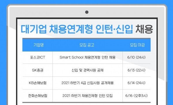8일 취업 플랫폼 잡코리아에 따르면 포스코ICT, 한화손해보험의 채용연계형 인턴사원 모집이 진행 중이며, KB손해보험 신입사원 공채와 SK증권 신입·경력사원 공채가 진행되고 있다.