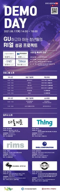 한편 이번 행사는 ‘구(GU)하고자 하는 청년들의 리(RI)얼 성공 프로젝트’를 캐치프레이즈로 유튜브 라이브로도 생중계 되며, 최우수상과 우수상, 참가상은 물론 가장 많은 응원 댓글을 받은 기업에게 사업화 지원금 베네핏이 제공된다.