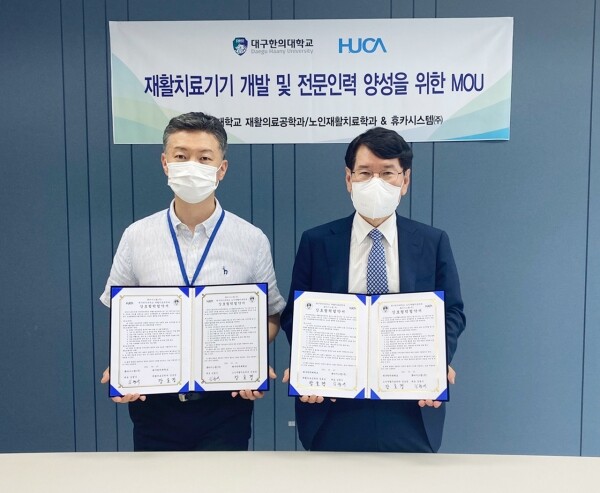[대학저널 오혜민 기자] 대구한의대학교(총장 변창훈) 재활의료공학과·노인재활치료학과는 노인재활치료 활용 재활로봇을 개발하고 있는 휴카시스템과 재활치료기기 개발 및 전문인력 양성을 위한 업무협약을 체결했다고 7일 밝혔다.