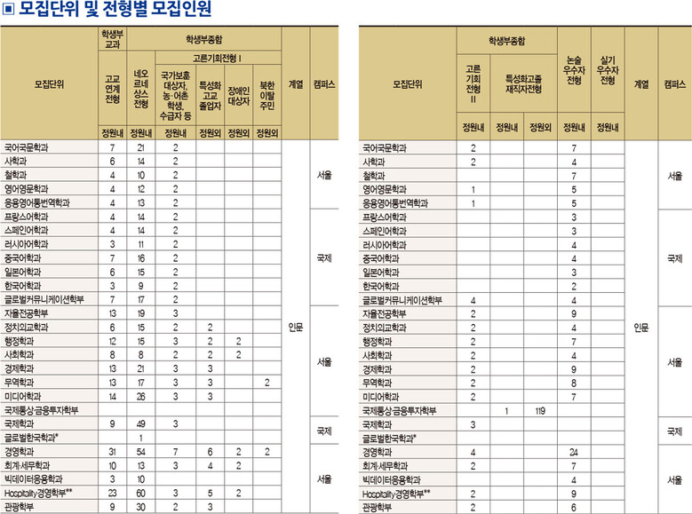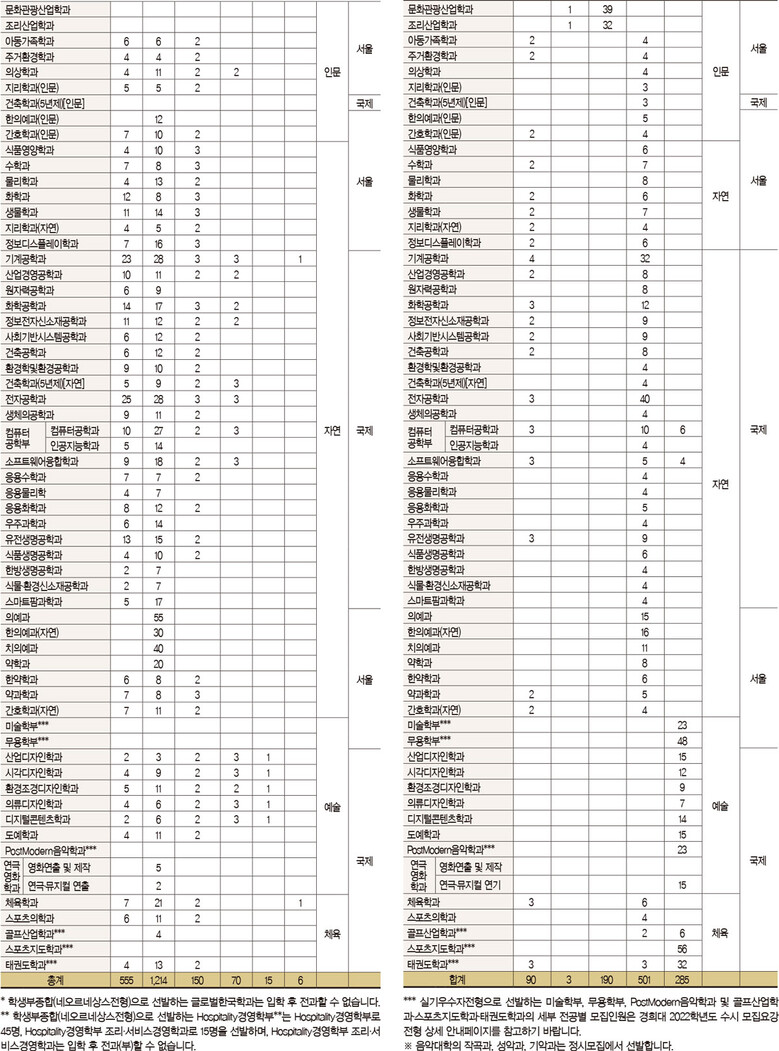 (인문계 2명, 자연계 3명, 예술·체육계 1명)까지 지원할 수 있다. 학교생활기록부 교과 80%, 비교과(출결·봉사) 20%를 합산해 총점 순으로 선발하고, 수능 최저학력기준을 충족해야 한다. 비교과(출결·봉사) 성적은 코로나19 상황을 고려해 일괄 만점 처리한다.