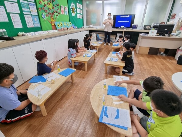 전북대 전라제주권 교육기부 지역센터가 마련한 드론 교육기부 프로그램에 참여한 아동들이 드론의 원리에 대한 설명을 듣고 있다. 사진=전북대 제공