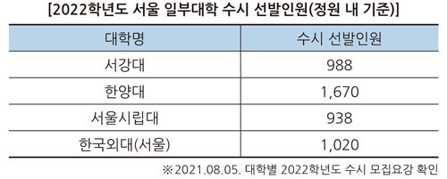 전년도까지는 서울 주요대학을 중심으로 학생부교과전형의 선발인원이 적었고, 연세대, 성균관대, 서강대 등과 같이 아예 선발하지 않는 대학도 많았기 때문에 선택의 여지가 없어 대부분의 학생들이 변수가 많은 학생부종합전형으로 도전할 수 밖에 없었다. 하지만 올해는 서울 주요 대학들에서도 학생부교과전형을 신설해 15개 대학 기준 학생부교과전형 선발인원이 전년대비 1,746명이나 증가했다. 이는 타 대학의 2022학년도 수시모집 선발하는 인원과 비교해보면 얼마나 늘어난 것인지 체감할 수 있다.