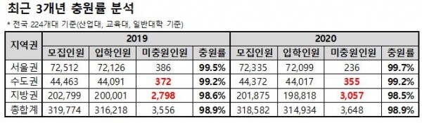 이같은 상황은 지역 소재별 대학 충원율 상황에서도 잘 드러난다. 서울 소재 대학들은 2020학년도 99.7%에서 2021학년도 99.5%로 0.2%p 감소했으나 수도권 소재 대학들은 99.2%에서 98.5%로 0.7%p 감소했다.