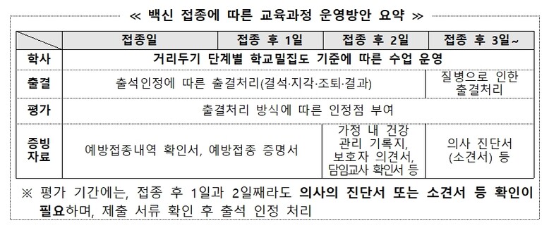 학생들의 접종일부터 접종 후 2일까지는 출석인정으로 처리(결석·지각·조퇴·결과)하고, 접종 후 3일째부터는 의사 진단서나 소견서를 첨부하면 질병 사유로 인한 출결 처리가 된다.