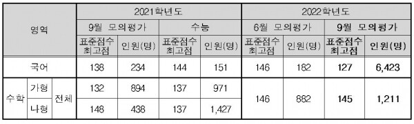 반면 수학영역의 경우 9월 모의평가 표준점수 최고점은 145점인 것으로 나타났다. 최고점자는 1211명으로, 지난해 9월 모의평가, 수능에 비해 최고점자 숫자가 적지만 지난 6월 모의평가보다는 많았다.