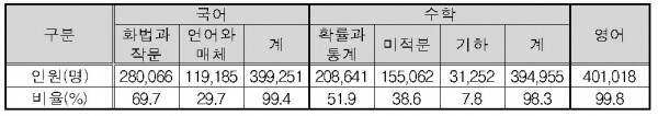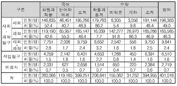 국어영역에서 선택 과목별 응시자 비율은 화법과 작문 70.1%, 언어와 매체 29.9%이었으며, 수학 영역에서 선택 과목별 응시자 비율은 확률과 통계 52.8%, 미적분 39.3%, 기하 7.9%이었다.