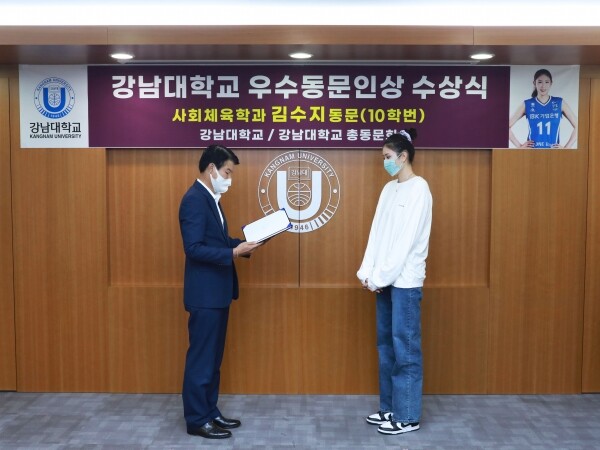 [대학저널 이승환 기자] 강남대학교(총장 윤신일)는 6일 도쿄올림픽 여자배구 국가대표 김수지 선수에게 '우수동문인상'을 수여했다고 밝혔다.