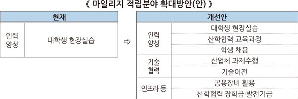 방안에 따르면 우선 현재 대학생 현장실습에 국한된 마일리지 적립 대상 활동을 계약학과 등 산학협력 교육과정과 학생채용, 산학 공동 과제수행, 기술이전, 공용장비활용 등 산학협력 전 분야의 활동으로 확대한다.