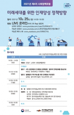[대학저널 이승환 기자] 교육부는 한국직업능력연구원 등 사회분야 연구기관과 25일 오후 2시부터 ‘미래세대를 위한 인재양성 정책 방향’ 주제로 제4차 공개토론회(포럼)를 개최한다고 24일 밝혔다.