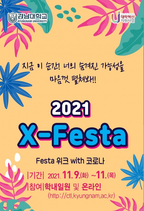 [대학저널 임지연 기자] 경남대학교(총장 박재규)는 오는 9일부터 3일 간 경남대 일원에서 재학생의 일상 회복을 지원하고 응원하는 캠퍼스 교육축제 ‘FESTA 위크 with 코로나’를 진행한다고 1일 밝혔다.