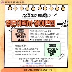 세종대에 따르면 실전 특강은 지난 9일 열린 영문 이력서 작성법과 오는 23일 열리는 영어면접 전략 특강 등으로 구성돼 있다. 특히 학생들이 실제 기업에 지원하고 면접을 보는데 도움을 받을 수 있는 내용을 담고 있다.