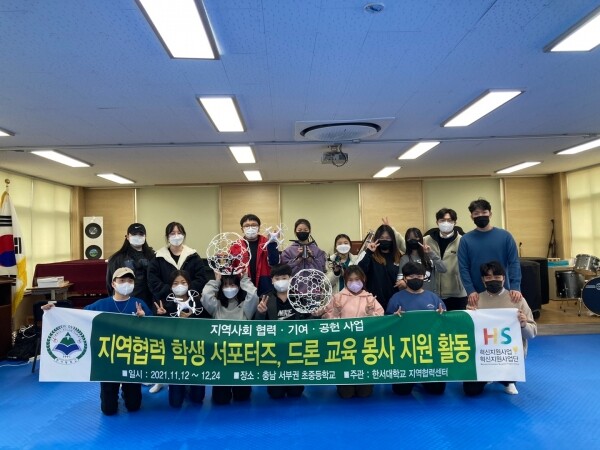 충청남도서산교육지원청 협조로 지난 12일에는 차동초등학교, 가사초등학교에서 한서대 지역협력 학생 서포터즈 봉사공헌지원단(한찬우 1팀장)이 학생들에게 폐플라스틱을 활용한 키링 제작 체험과 축구 드론, 일반 드론을 조정해 보는 체험 활동을 펼쳤다.