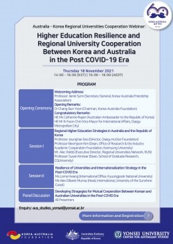 이번 웨비나는 ‘포스트 코로나 시대의 고등 교육 회복과 지역 대학 협력’을 주제로 오는 18일 오후 2시부터 2시간 동안 진행된다. 연세대 호주연구센터와 한호재단이 지난달 개최한 KAF-CAS 특별 세미나에 이어 한국-호주 외교 관계 수립 60주년을 기념하는 두 번째 행사로 기획됐다.