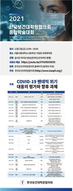 1세션에서는 ‘COVID-19 대유행과 동아시아 지역 보건대학원의 경험’, 2세션에서는 ‘건강재난과 보건학적 통합대응’ 주제 발표와 토론이 진행된다. 이어 전국 보건대학원생들의 연구 논문 발표가 e-포스터로 진행된다.