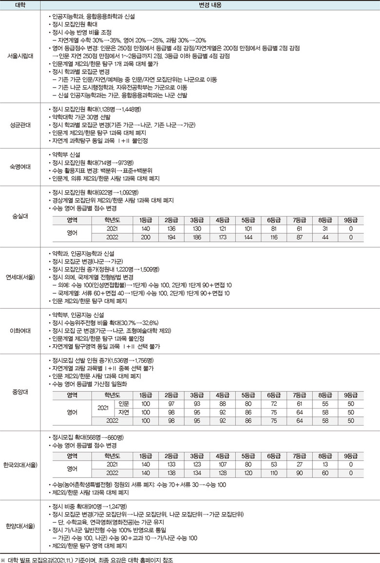 한국외대(서울)는 1~2등급 간 점수 차를 7점에서 2점으로, 1~3등급 간 점수 차를 17점에서 6점으로 변경해 영어 영역의 영향력을 줄였다. 중앙대는 인문, 자연 영어 등급 점수를 통합하면서 인문계열 등급 간 점수 차가 줄었으며, 서울시립대도 계열별 영어 등급 점수를 통합했다.