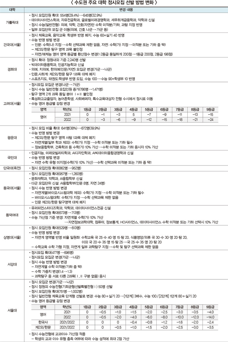 올해는 2021학년도와 비교해 선발 방법에 변화가 많다. 전형 유형의 변화뿐 아니라 전형 유형별 선발 인원, 융합/AI 관련 모집단위 신설, 모집 군 이동 등 대학별로 변경되는 내용이 광범위하다.