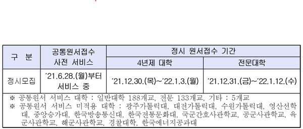 2022학년도 대입 수시 원서접수 기간은 4년제 대학이 오는 30일부터 내년 1월 3일까지로 대학별로 3일 이상 실시한다. 수험생들은 대학별 접수기간이 다르기 때문에 확인이 필요하다. 전문대학은 오는 31일부터 내년 1월 12일까지다.