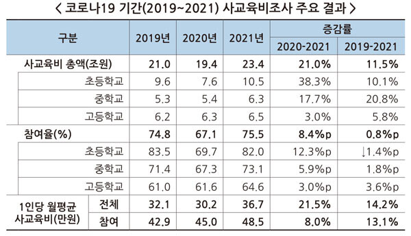 ‘2021년 사교육비 조사 결과’에 따르면 2021년 초·중·고 사교육비 총액은 약 23조4천억원으로, 2020년 약 19조4천억원 대비 4조1천억원(21.0%p) 증가했다. 이는 코로나19 유행 이전보다 늘어난 수준으로 2007년 조사 시작 이래 역대 최다를 기록한 수치다.