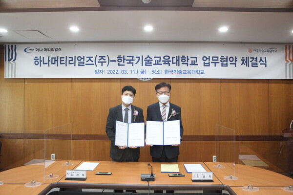 이성기(오른쪽) 한국기술교육대 총장과 오경석 하나머터리얼즈 대표이사가 업무협약서를 들고 기념촬영을 하고 있다. 사진=한국기술교육대 제공