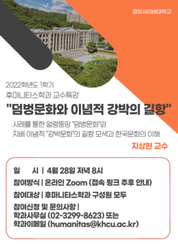경희사이버대 후마니타스학과가 ‘2022학년도 후마니타스학과 교수 특강’을 줌(Zoom)으로 연다.
