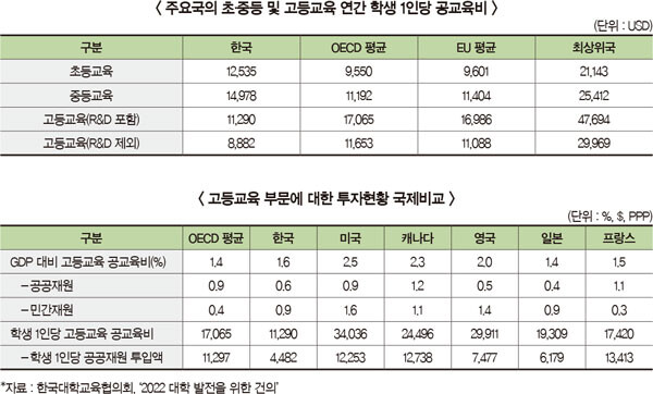 2021 OECD(경제협력개발기구) 교육지표에 따르면 OECD 국가 중 우리나라 정부가 대학에 지원하는 공교육비는 39.7%로 OECD 평균 66.2%에 크게 못 미친다. 특히 정부가 90% 가까이 공교육비를 지원하는 핀란드와 노르웨이 등 북유럽 국가와 비교하면 절반에 불과하다. 반대로 민간 지출은 60% 수준으로 OECD 국가 중 영국과 일본, 호주, 미국 등에 이어 높은 편에 속한다.