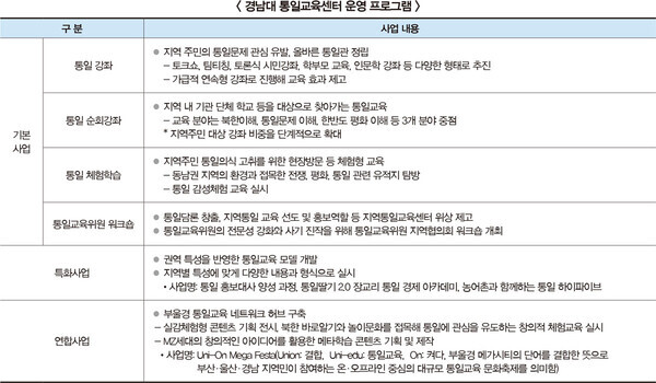경남대는 2020년 4월부터 영남권역 통일교육센터를 운영하며 지역간 평화·통일교육 서비스의 균형적 제공을 위해 노력해왔다. 특별한 조건 없이 원하는 통일교육에 접근할 수 있도록 하는 것을 원칙으로 온·오프라인 교육을 병행, 많은 사람들이 자율적이고 탄력적으로 참여할 수 있는 교육 체제를 마련한 것이다.