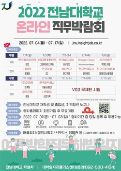 [대학저널 오혜민 기자] 전남대학교 대학일자리플러스센터가 4~17일 학생과 졸업생, 지역청년을 대상으로 온라인 직무박람회를 연다.