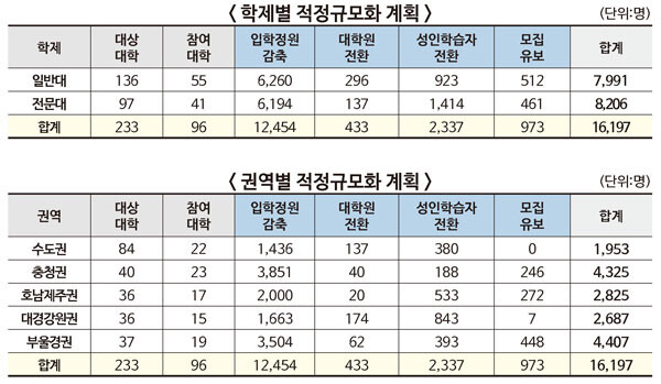 이에 따라 올해부터 오는 2025년까지 일반대는 학부 정원 7991명, 전문대 8206명 등 1만6197명의 정원이 줄어든다. 이 중 입학정원을 포기하는 순수 '입학정원 감축'은 일반대 6260명, 전문대 6194명 등 1만2454명이다.