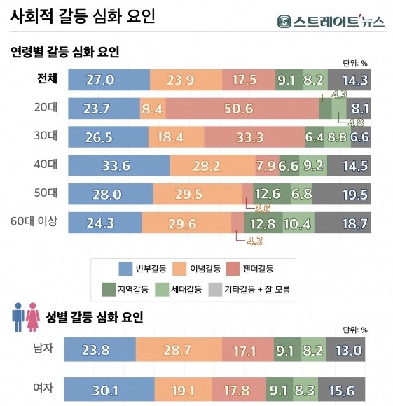 조사 결과 20~30대는 젠더갈등, 40대는 빈부갈등, 50대 이상은 이념갈등을 각각 사회적 갈등 요인으로 꼽았다.