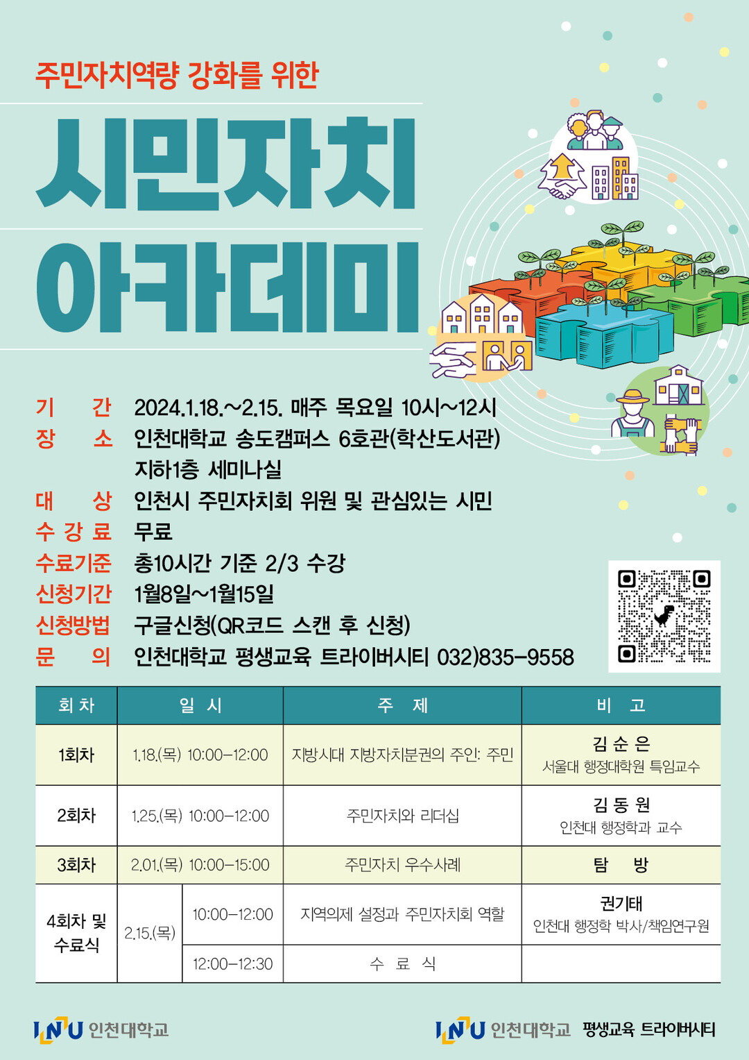 인천대는 실질적 지방시대 실현을 위해 주민의 자치 역량이 지역발전을 위한 핵심적인 경쟁력으로 대두되는 만큼 지역거점국립대학으로서 시민자치력 강화를 교육적 목표로 전문적이고 다양한 주제의 커리큘럼을 마련했다고 밝혔다.