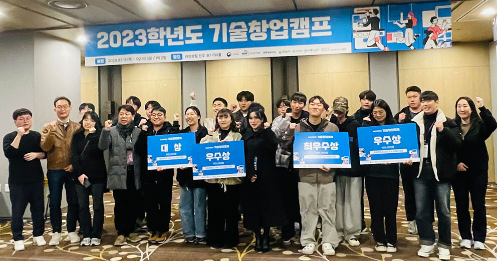 ‘2023학년도 기술창업캠프’ 수상자 및 참가자들이 기념촬영을 하고 있다. 사진=원광대 제공