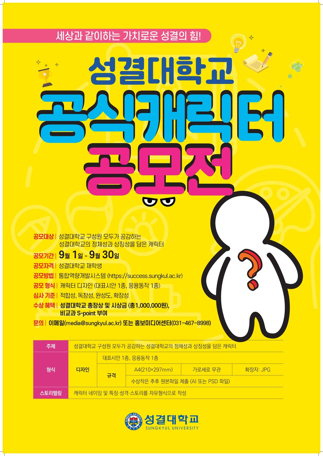 이번 공모전은 성결대 재학생 누구나 참여할 수 있으며, 응모자는 성결대 통합역량개발시스템 웹사이트를 통해 관련 서류를 다운로드한 후 캐릭터의 대표 디자인과 함께 캐릭터의 특징과 성격을 설명한 스토리를 작성하여 제출하면 된다.