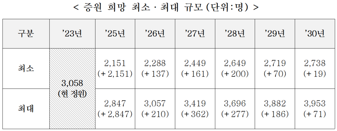 2025학년도 2,151~2,847명 증원 요청, 2030년까지 최대 3,953명 희망